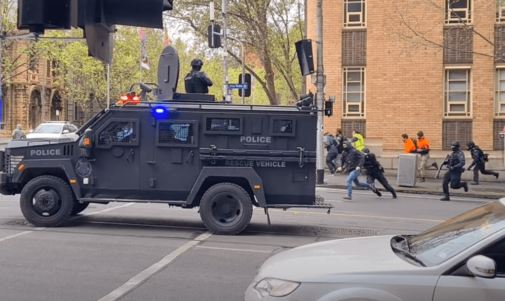 Victoria Police have moved to snuff out further Tradie Protests against Mandatory vaccinations in Melbourne’s CBD. Specialist vehicles arrived, with heavy support on foot. Some of those on the march scattered as rubber bullets were fired at them.
