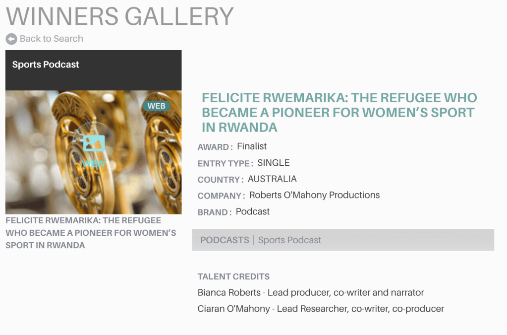 Bianca Roberts and Ciaran O’Mahony’s podcast on a women’s sports initiative promoting healing and equality in Rwanda, has been honoured as a finalist at the New York Festivals (NYF) Radio Awards.